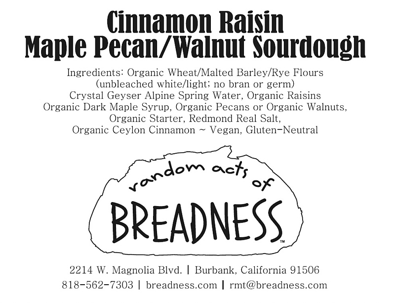 Ingredients: Organic Unbleached White Bread Flour Blend (wheat, malted barley, rye), Crystal Geyser Alpine Spring Water, Organic San Francisco Sourdough Starter, Organic Ceylon Cinnamon, Organic Dark Maple Syrup, Organic Walnuts, Organic Raisins, Redmond Real Salt. (organic, vegan)