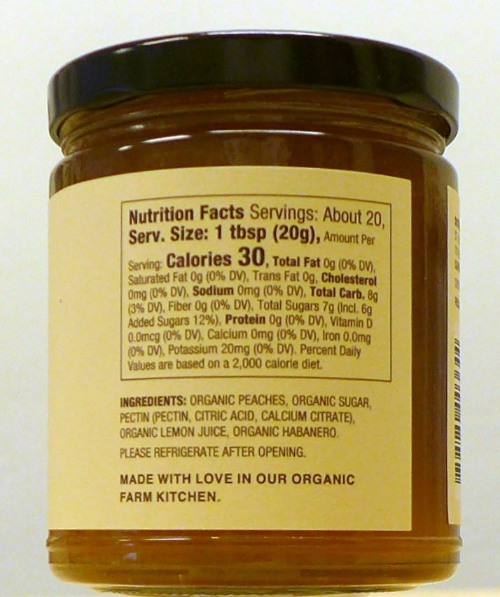 Ingredients: Organic Peaches, Organic Sugar, Pectin (Pectin, Citric Acid, Calcium Citrate) Organic Lemon Juice, Organic Habanero